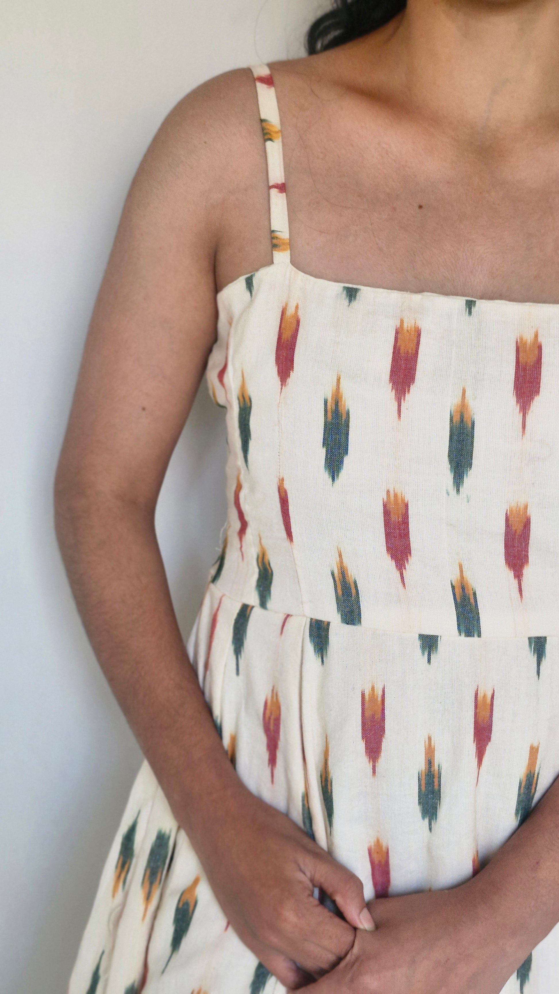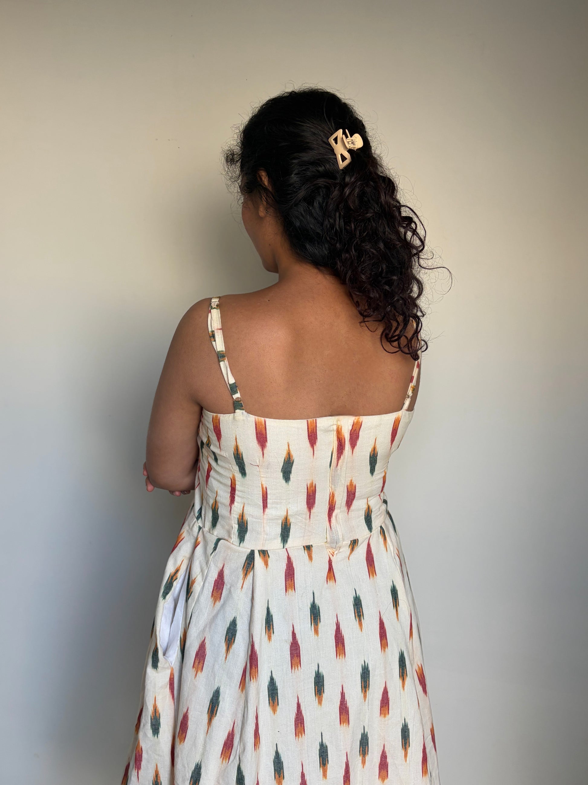 Crafted in breathable ikat fabric, this ankle-length dress blends timeless design with everyday comfort. Featuring a flattering silhouette, it comes with functional side pockets for ease and a concealed back zipper for a neat, structured fit. Perfect for both casual outings and elevated day wear, this piece is designed to move effortlessly with you.