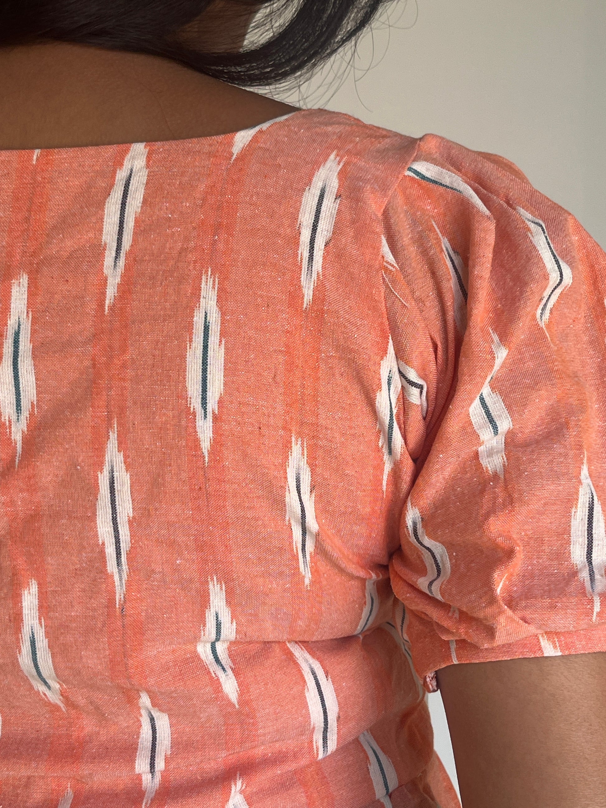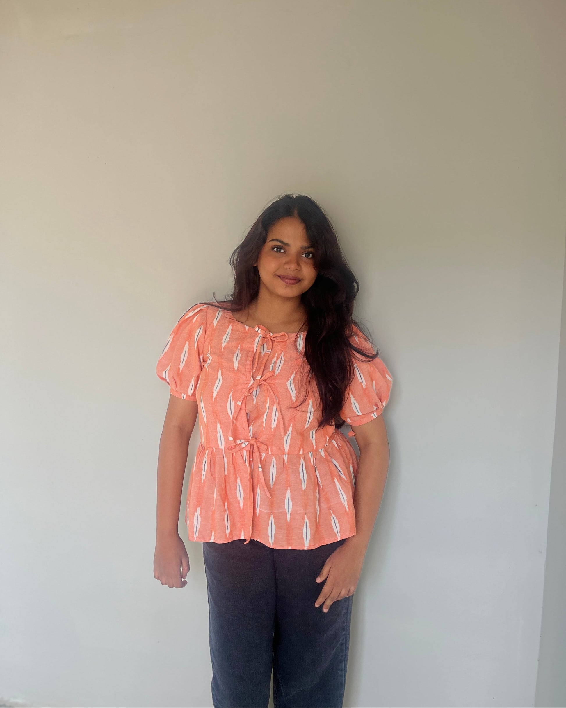 Add a touch of effortless charm to your wardrobe with this ikat bow top, crafted from soft and breathable ikat fabric. Designed with a flattering peplum silhouette, it features delicate bow tie-up detailing at the front, adding a feminine and playful accent to the look. The gently gathered waist enhances comfort while creating a graceful fall.